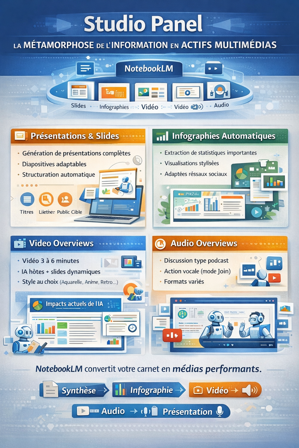 Grâce aux capacités multimodales avancées (notamment celles issues de l’architecture Gemini), NotebookLM peut transformer un carnet complet en :