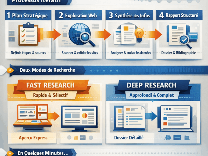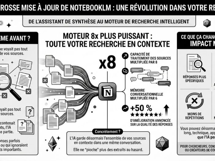 L’innovation la plus structurelle introduite en 2025 au sein de NotebookLM est sans conteste la fonctionnalité Deep Research. Jusqu’alors, NotebookLM fonctionnait comme un environnement fermé : l’utilisateur importait manuellement ses documents, et l’IA travaillait exclusivement à partir de ce corpus. Deep Research transforme ce paradigme. NotebookLM devient un agent de recherche actif, capable d’explorer le […]
