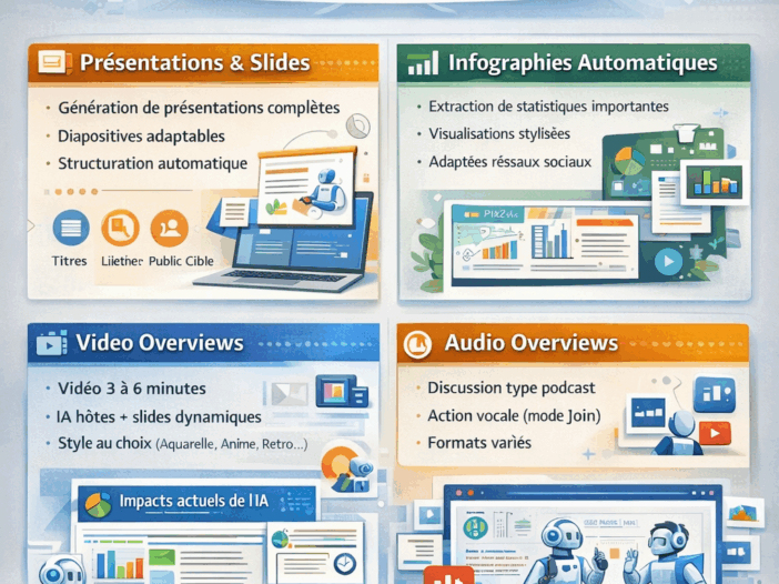 L’écosystème créatif de NotebookLM Le Studio Panel représente la transformation la plus visible et stratégique de NotebookLM entre 2025 et 2026. NotebookLM ne se contente plus d’analyser des documents. Il convertit la connaissance en actifs multimédias exploitables, sans exiger de compétences en design, montage ou narration. Cette mutation marque le passage : De l’analyse textuelle➜ […]